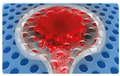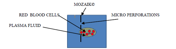 The needle will create disruption in this stratified complex and on the wall of the AVF. As long as the needle is in place the frangible joint is materially filled by the needle itself and does not bleed. During the removal of the needle, chaotic forces begins in the virtual needle tunnel that cannot be filled without obtaining a clot which needs to be in place from the venous wall to the skin. Clinical experience reported by Dr M CHAWKI the inventor of Mozaïk allows comprehensive assessment of different situations of post dialysis puncture sites delayed bleeding. In the next figures dotted lines represents Mozaik microperforated device, red cells and plasma surrounding blood cells (Figure 8).