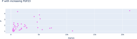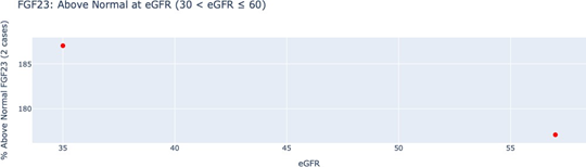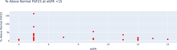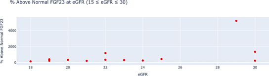 We observe that the high average value of FGF23 is partly due to 3 statistical outliers—the three highest points, which are over 1000% above the normal level. The other cases range between 200% and 350% above normal.