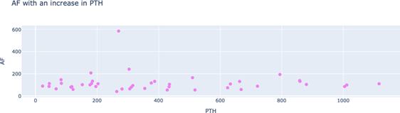 Concentration of data: Most of the points are located in the PTH range between 0 and 500, while AF remains in the range below 200. This suggests that for most cases, regardless of the PTH value, AF does not increase significantly.