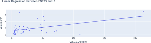 A positive relationship is observed between the two variables. Linear regression is used to examine the relationship between FGF23 and P, scaling the values of FGF23 for better interpretation and visualizing the results.