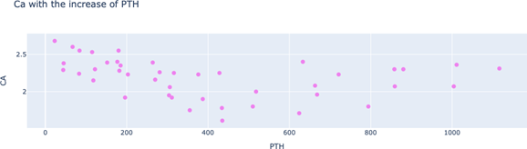 This graph displays the values of PTH (on the X-axis) and Ca (on the Y-axis), with each point representing an observed data value. Possible relationship between the two variables: