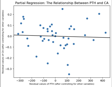 Based on the presented regression results, we can conclude that there is no statistically significant relationship between PTH and the dependent variable in this model. This finding is consistent with the visualization, which shows no clear link between PTH and CA. The results also highlight the significance of other variables, suggesting that there may be other factors impacting the health indicators being studied.