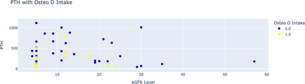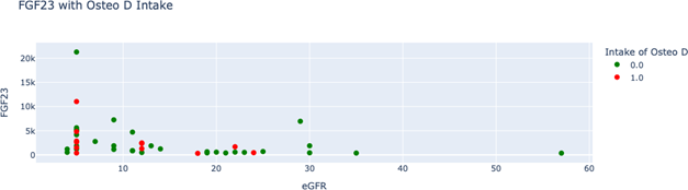 High values of eGFR (above 30): At these eGFR values, the levels of FGF23 are relatively low. In this range we do not have patients who take Osteo D, therefore it is not possible to discuss the impact of Osteo D on the levels of FGF23. The graph fails to demonstrate a clear trend indicating that patients who take Calcitriol experience a significantly smaller increase in FGF23 compared to those who do not, at equivalent eGFR levels. While there are fluctuations in FGF23 levels, the differences between the groups are not substantial enough to draw a conclusion that Calcitriol has a significant impact on FGF23 when eGFR is held constant.