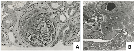Figure 1(A) Cresentic glomerulus showing disappearance of normal renal texture (white arrow). (B) Electron-microscopy shows focal segmental glomerulosclerosis showing podocyte foot process effacement (white arrow).