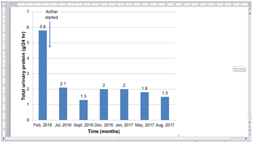 Figure 2 An abrupt increase in random urinary protein in February 2016. After Acthar treatment, proteinuria fell in 2 months.