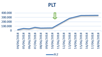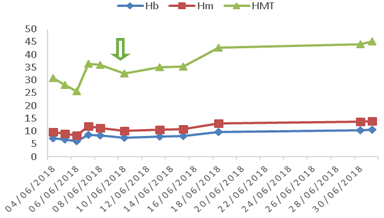Figure 1 Recovery of hemoglobin (Hb), number of red blood cells (Hm) and hematocrit (HMT) after administration of Eculizumab. The arrow represents medication administration date.